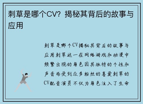 刺草是哪个CV?揭秘其背后的故事与应用 刺草,这一在网络游戏和动漫中频繁出现的角色,因其独特的个性和声音而受到众多粉丝的喜爱。刺草的CV(配音演员)不仅为角色注入了生命,也为其背后的故事增添了丰富...