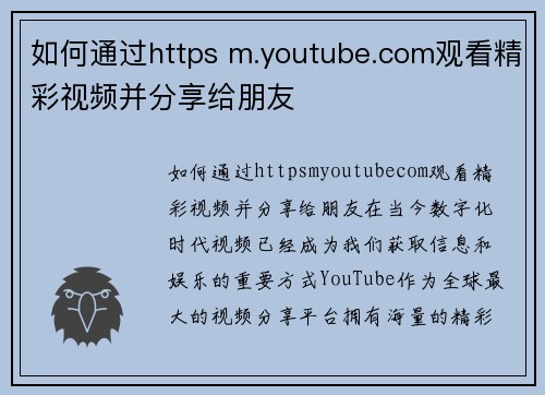 如何通过https m.youtube.com观看精彩视频并分享给朋友 在当今数字化时代,视频已经成为我们获取信息和娱乐的重要方式。YouTube作为全球最大的视频分享平台,拥有海量的精彩视频供用...
