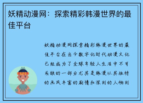 妖精动漫网:探索精彩韩漫世界的最佳平台 在当今数字化时代,动漫文化已经成为了全球年轻人生活中不可或缺的一部分。尤其是韩漫,以其独特的画风、丰富的剧情和深刻的人物刻画,吸引了大量的粉丝。而在众多的动...