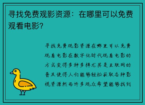 寻找免费观影资源:在哪里可以免费观看电影? 在数字化时代,观看电影的方式变得多种多样,尤其是互联网的普及,使得人们能够轻松获取各种影视资源。然而,许多观众希望能够找到免费的观影资源,以节省开支。本...